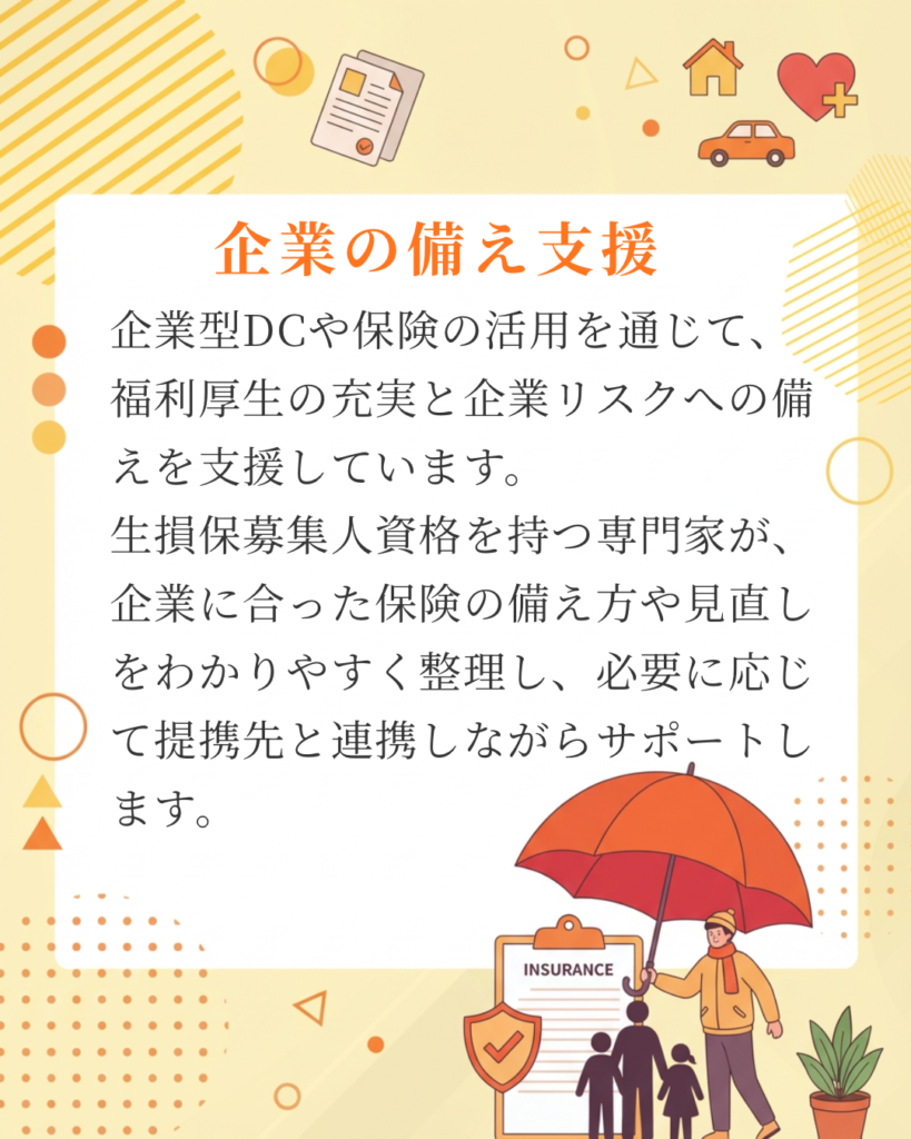 | 事業内容 | 1.企業向けFP顧問サービス 従業員のライフプラン相談や社内向け マネーセミナーを通じて 企業の福利厚生を強化する支援 2.キャリア教育事業 子どもから大人までを対象に、 キャリア形成を目的とした教育イベント・ 講座を企画・運営 3.個人および法人向け金融・保険教育 家計管理・資産形成・生命保険の基礎理解など、 暮らしと経営に役立つ金融教育 |