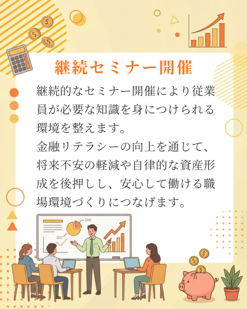 当法人では、従業員向けセミナーや個別相談を通じて、福利厚生としての金融教育をお手伝いしています。